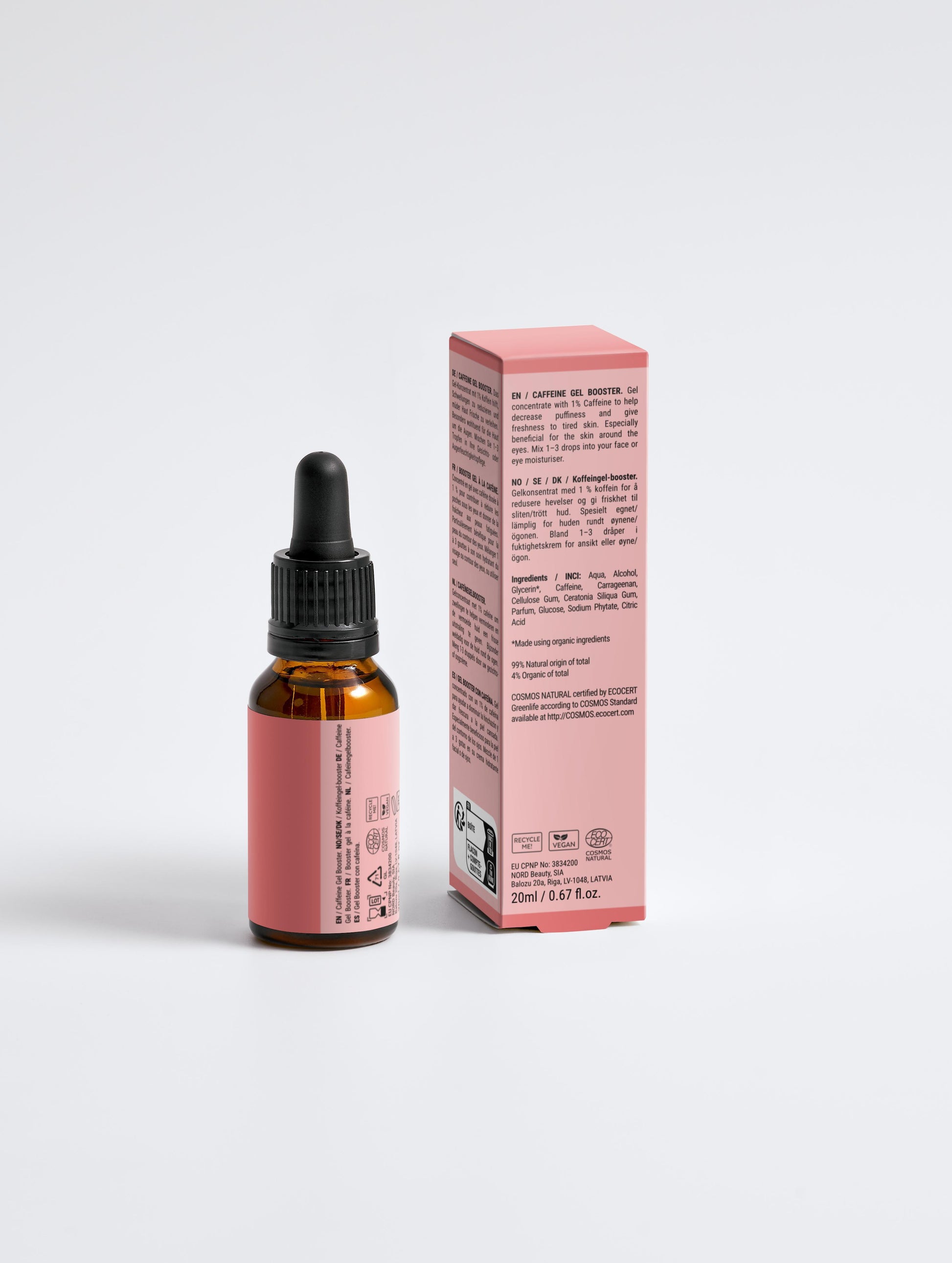 Gelkonzentrat mit 1 % Koffein, das Schwellungen reduziert und müder Haut Frische verleiht. Besonders wohltuend für die Haut um die Augen. Mischen Sie 1–3 Tropfen in Ihre Gesichts- oder Augenfeuchtigkeitscreme.
