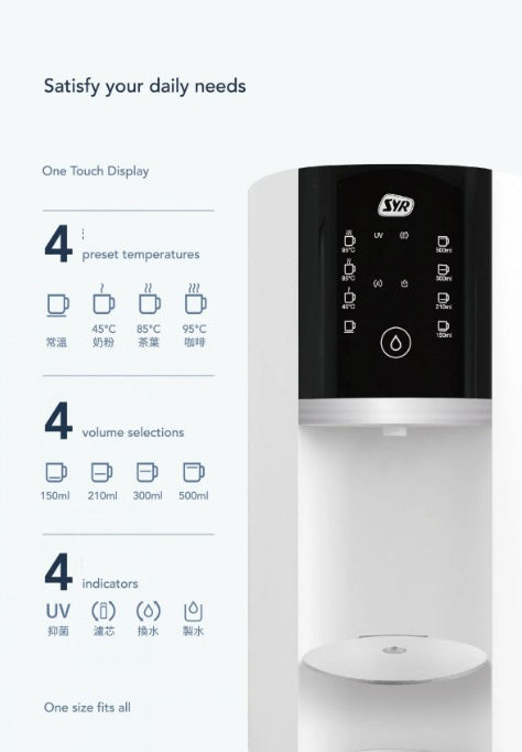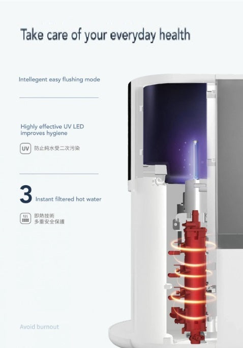 Mit der Technologie für reines Heißwasser in 3 Sekunden kann dieser Wasserspender 4 voreingestellte Wassertemperaturen mit 4-in-1-Filter und UV-LED bereitstellen. Er kann in mehreren Schichten filtern und Bakterien, Viren, Schwermetalle, Pestizide usw. effektiv entfernen.